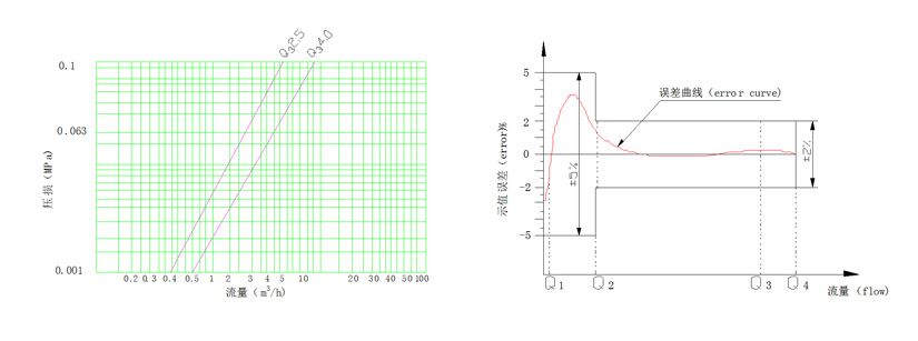 壓(yā)力損(sǔn)失曲線 Pressure loss curve 示值誤差(chà)限與(yǔ)流量曲線FLOW-ERROR CURVE