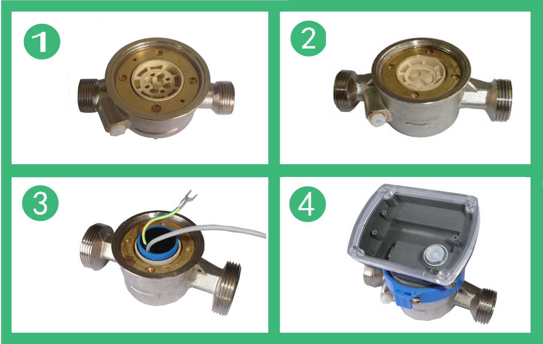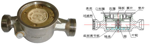 CD02TAR單流束無磁熱量表流(liú)量計(jì)的結構如圖,其工作原理是:熱水進入流量計(jì),經進水導向孔(kǒng)衝擊計量腔內的葉輪旋轉,再經出水導向孔流出流量(liàng)計。葉輪上麵嵌有(yǒu)不鏽鋼膜片,隨葉輪旋轉,在隔板上(shàng)端接近不鏽鋼膜片處可裝電感類傳感器,接受葉輪(lún)旋轉的周(zhōu)期信號。