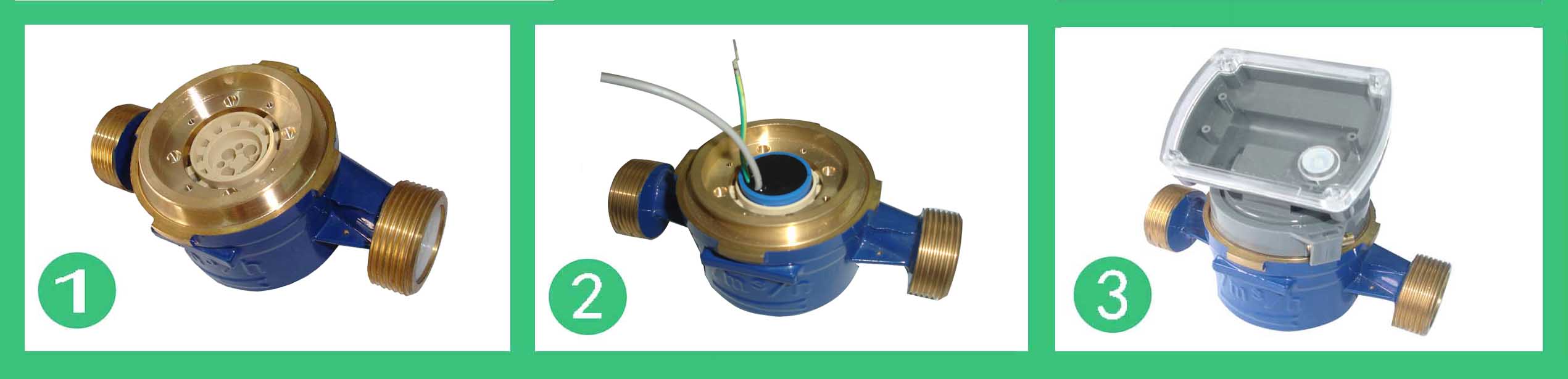 CD02TAR單流(liú)束(shù)無磁(cí)熱量(liàng)表流量計的結構如圖,其工作原理是:熱水(shuǐ)進入流量計,經進水導向(xiàng)孔衝擊計量腔內(nèi)的葉輪旋轉,再經出水導向孔流出流量計。葉輪(lún)上麵嵌有不鏽鋼膜片,隨葉輪旋(xuán)轉,在隔板上端接近不鏽鋼膜片處可裝電感類傳感器,接受(shòu)葉輪旋轉的周期信號(hào)。